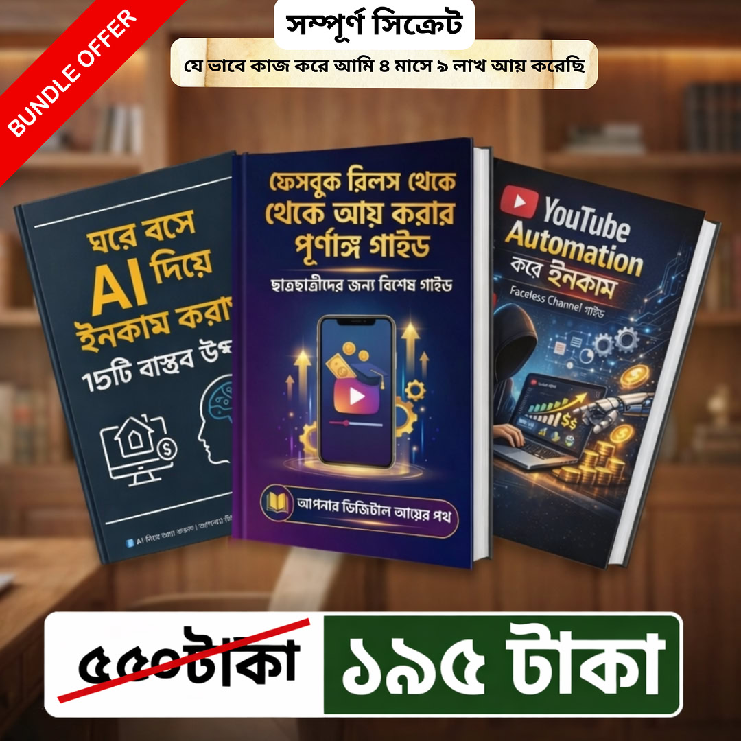 Student, Job Holder ও Beginner-দের জন্য ৩টি প্রিমিয়াম ইবুক। AI ইনকাম, Faceless YouTube, Facebook Reels গাইড।